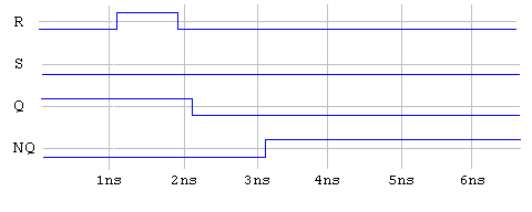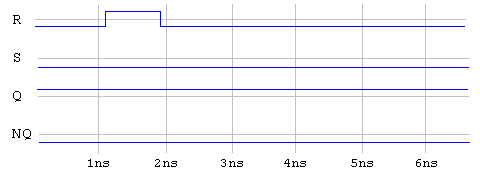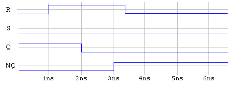 q<=transport r nor nq after 1ns; nq<=transport s nor q after 1ns;If the transport delay model were used, the result of the same simulation shown in the last diagram would result in the following timing diagram.